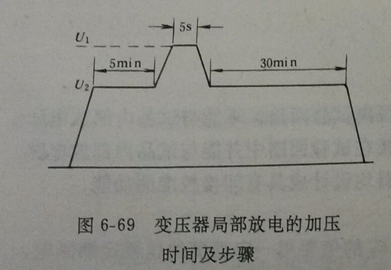 变压器局部放电试验的加压时间及步骤如图6-69所示。试验时首先将试验电压升到U2,并在此电压下进行局部放电测量,保持5min;然后将试验电压升到U1,保持5s;后将电压降到U2,再进行测量:U1=√3Um/√3=Um(设备高工作电压);U2=1.5Um/√3,U2下允许的放电量Q<500pC;或U2=1.3Um/√3,U2下允许的放电量Q<300pC。