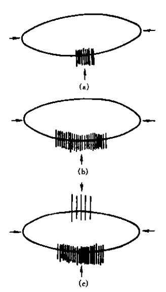 电晕放电出现在金属尖端或边缘电场集中部位,电晕放电起始仅出现在试验电压的半周内,并对称分布在电压峰值处两侧,见图(a)。随着电压增加,脉冲个数(宽度)对称增加,见图(b)。如放电尖端电极处于高电位,电晕放电出现在试验电压的负半周。如尖电极处于地电位,放电脉冲则出现在正半周。对某一电极来讲,电晕初始出现在一个半周,但当电压升高超过起始电压很多时,在另一个半周也会出现幅值大,放电脉冲个数较少的放电,如图(c)所示。