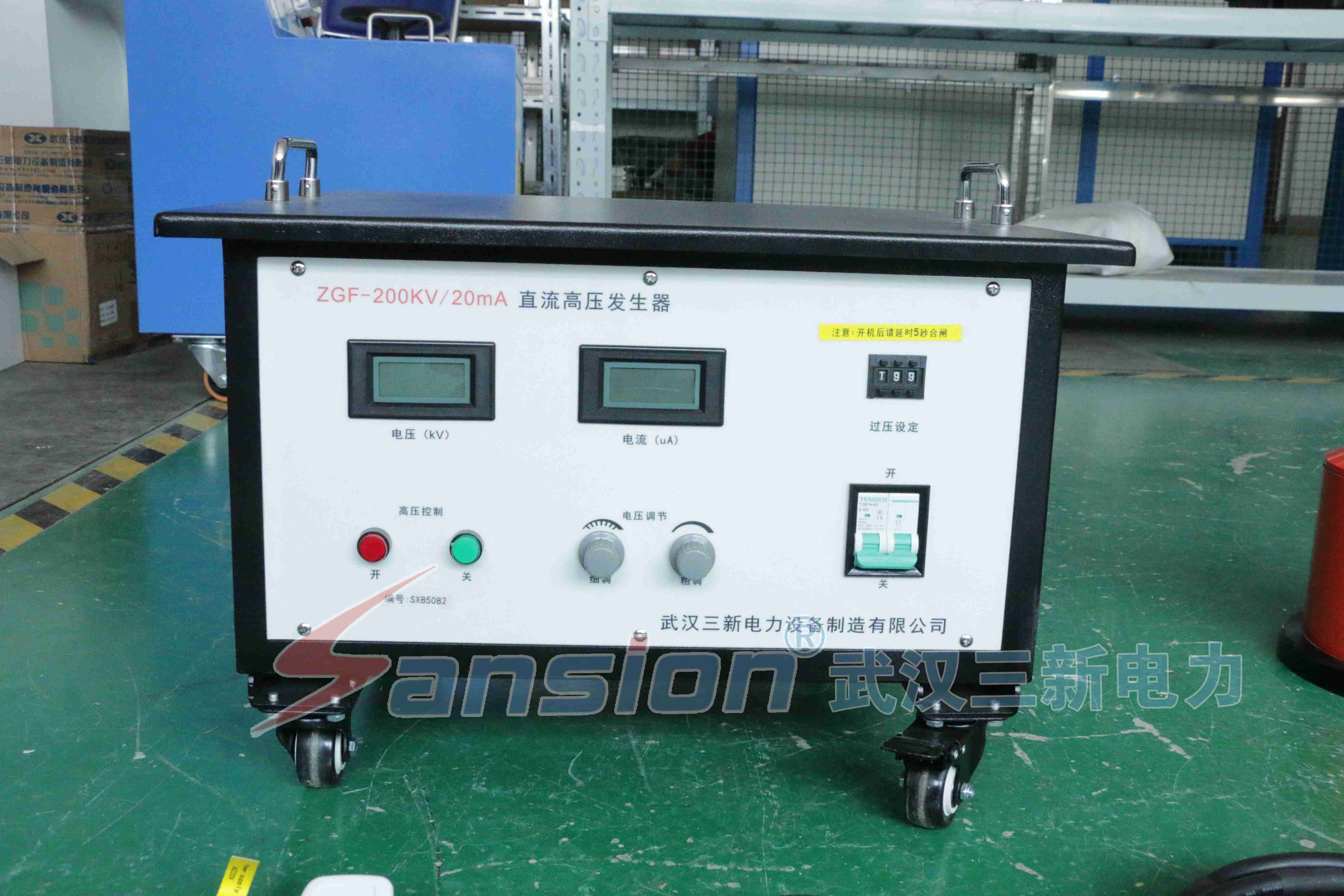 三新电力生产的ZGF-200kV/20mA直流高压发生器有7大优点(1)体积更小、重量更轻、更美观、更可靠、操作简便、功能齐全,便于野外使用,是新世纪最理想的可靠产品(2)采用最先进技术、工艺制造,率先应用最新的PWM高频脉宽调制技术、脉冲串逻辑阵列调制,采用大功率IGBT器件,利用高频技术提高频率,频率高达100kHz,从而使输出高压稳定度更高,波纹系数更小(3)按免维修设计,主要部件均选用美、德、日等国进口先进技术的元器件,经久耐用,不怕连续对地直接短路放电(4)精度高、测量准确。电压、电流表均为数字显示,电压分辨率为0.1kV,电流分辨率为1uA,控制箱上电压表直接显示加在负载试品上的电压值,使用时无需外加分压器,接线简单。仪器具有高、低压端测量泄漏电流,高压端采用圆形屏蔽数字表显示,不怕放电冲击,抗干扰性能好,适合现场使用(5)电压调节稳定度高,全量程平滑调压,输出电压调节采用进口单个多圈电位器,升压过程平稳,调节精度高,并设计有粗调和细调功能。电压调节精度优于0.1%,电压、电流测量误差优于1.0%,脉动因数优于0.5%(6)负极性输出、零启动、连续可调、有过电压、过电流、回零、接地保护、特有断线保护等各种保护功能。自动保护电路功能强,保护完善可靠,操作安全,各种技术指标均优于行业标准及优于同类产品(7)方便的过电压整定设置功能,采用了数字拨盘开关,能将整定电压值直观显示,操作更随意,显示数值单位为kV。