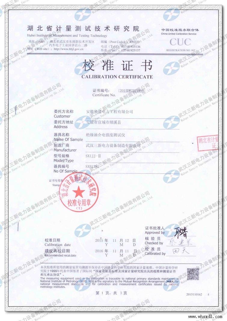 20151112-SXIJJ-II绝缘油介电强度测试仪校准证书